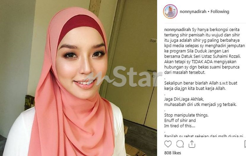Pemilik nama Nonny Nadirah Zainuddin ini menjelaskan perkara itu menerusi laman Instagram selepas artikel sebuah portal hiburan yang mengatakan sihir pemisah punca perceraiannya.