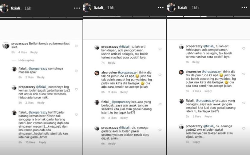 "Ini adalah contoh lelaki yang tidak guna... Awal-awal dah gadai barang isteri, entah-entah wang isteri pun kau kebas," antara komen pengikut Fizi mengenai kenyataan individu tersebut.