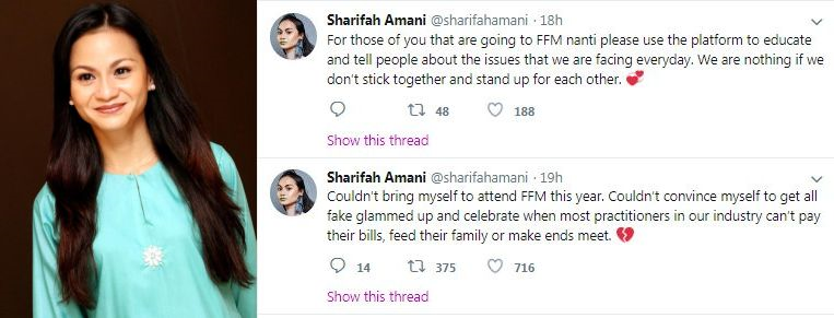 "Saya tidak dapat meyakinkan diri untuk berpura-pura untuk kelihatan cantik dan meraikan apabila kebanyakan penggiat seni dalam industri kita tidak dapat membayar bil, memberi makan kepada keluarga atau memenuhi keperluan mereka," katanya menerusi Twitter.