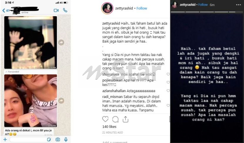 "Sebab itu saya terpaksa muat naik paparan skrin mesej yang dihantar sebab geram dengan perangai dia seperti 'makcik bawang'," kata Zetty kepada mStar Online.