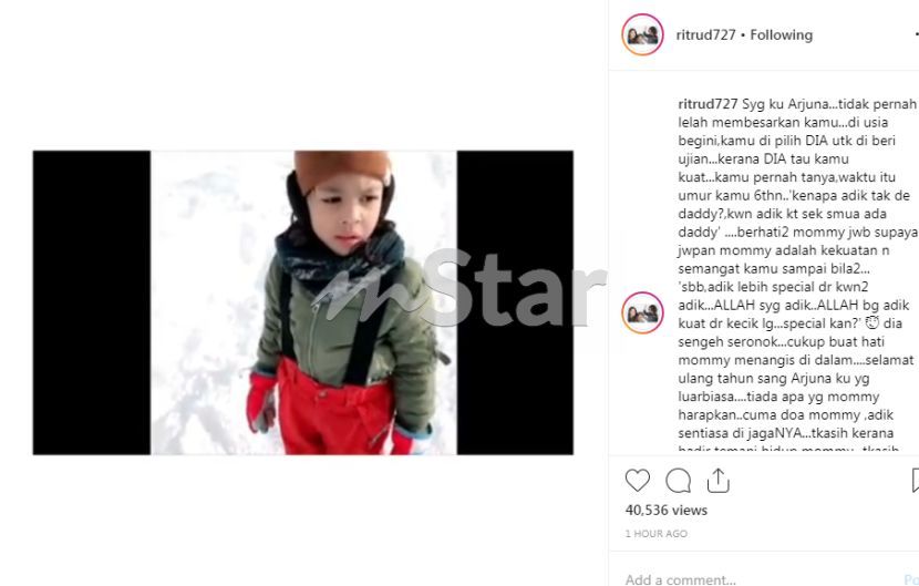 Pemilik nama sebenar Rita Rudaini Mokhtar berkongsi perkara itu sempena ulang tahun kelahiran anak lelakinya ke lapan tahun itu pada Isnin, 29 April 2019.