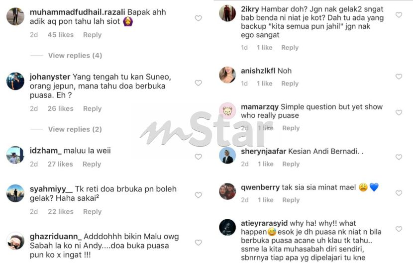 "Sejujurnya saya bukan tak tahu doa berbuka, cuma ketika itu saya sedang menjalani penggambaran televisyen dan bukannya untuk mereka. Kami sedang bergurau dan mereka datang bawa kamera dan terus rakam.