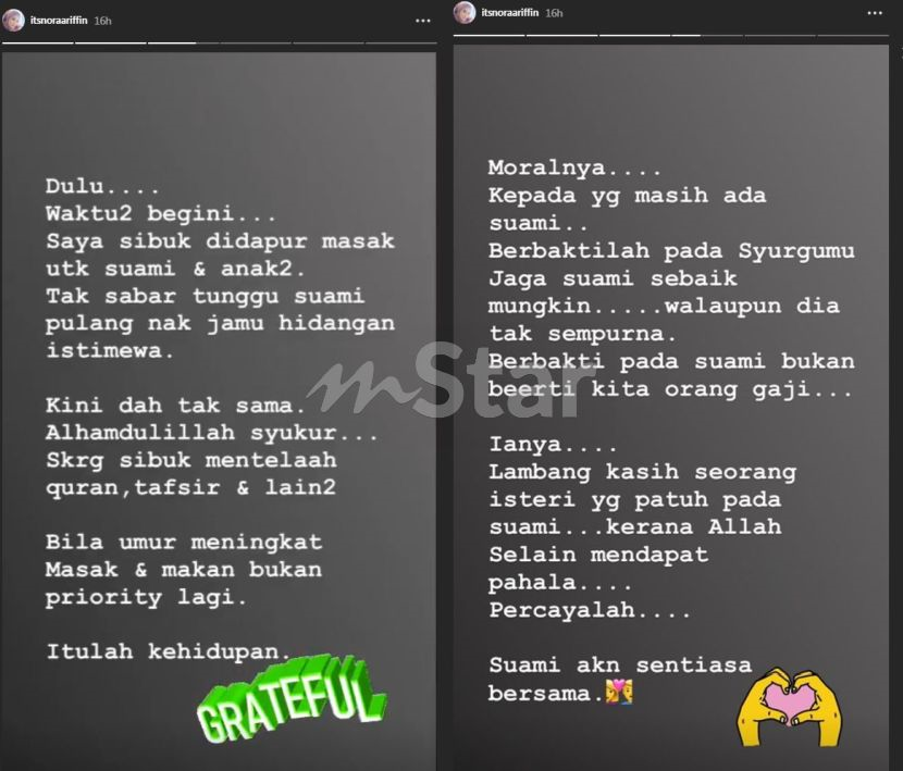 "Bila umur meningkat masak dan makan bukan keutamaan lagi. Itulah kehidupan," tulis Nora menerusi Instastory miliknya.
