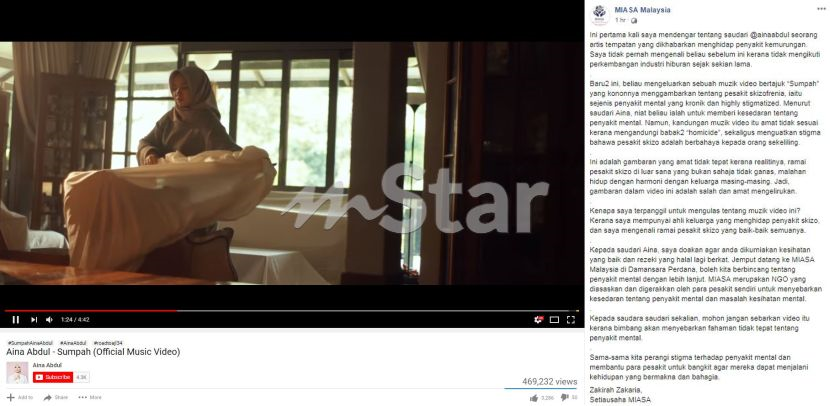 PERSATUAN Sokongan dan Kesedaran Penyakit Mental (Miasa) mengecam muzik video Sumpah nyanyian Aina Abdul yang memberi gambaran buruk terhadap penghidap masalah mental iaitu skizofrenia.