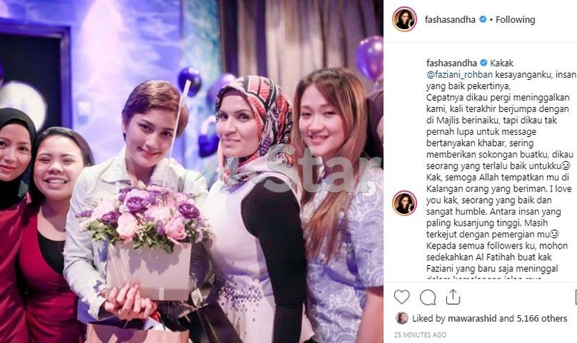BERITA pemergiaan usahawan kosmetik Faziani Rohban Ahmad akibat kemalangan pagi Sabtu turut dirasai pelakon Fasha Sandha yang juga rakan baik kepada Allahyarham.