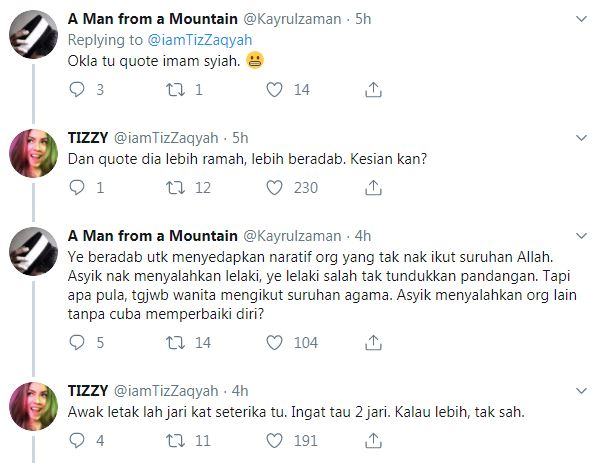 "Tak perlu burukkan lagi kedaan dengan cara dakwah begini. Tak salah pun jadi friendly," tulis Tiz di Twitter.