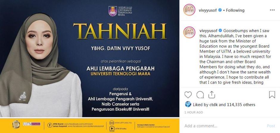 USAHAWAN terkenal, Datin Vivy Yusof memaklumkan khabar gembira apabila dia kini dilantik sebagai sebahagian daripada ahli lembaga Pengarah Universiti Teknologi Mara (UiTM).