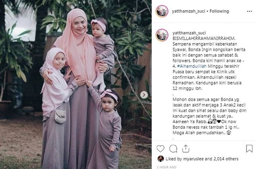 "Bismillahirrahmannirahim... Sempena mengambil keberkatan Syawal, bonda (Yatt) ingin kongsikan berita baik ini dengan semua sahabat dan pengikut, bonda kini hamil anak keempat.