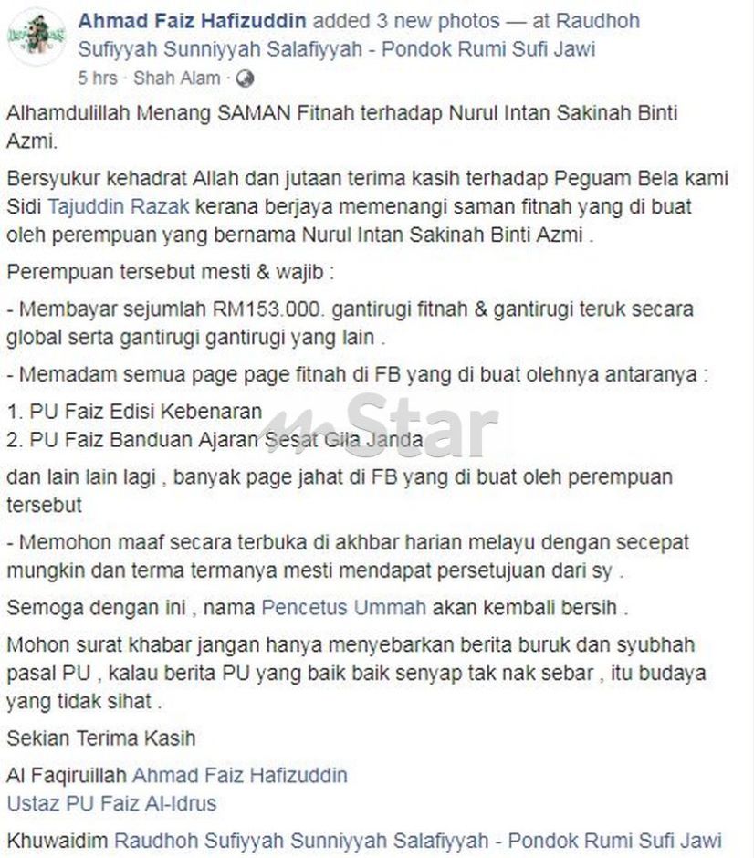 Menurut PU Faiz atau nama sebenarnya Ahmad Faiz Hafizuddin Rosi, 30, dia bersyukur apabila pihaknya menang dalam saman fitnah terhadap individu tersebut.