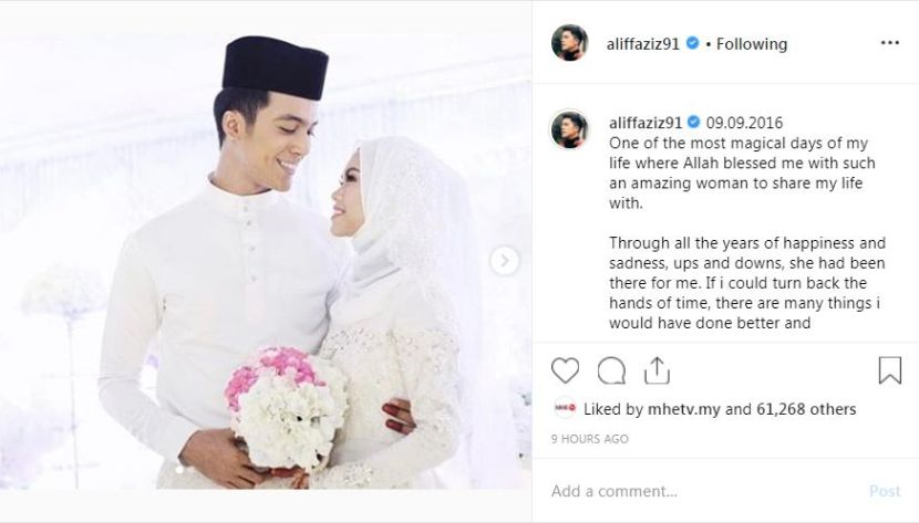 Menerusi catatan Aliff bersama dua keping gambar selepas mereka diijabkabulkan tiga tahun lalu, dia seperti menyesali setiap perbuatannya sebelum ini dan menganggap ia dugaan berat dalam hidupnya.