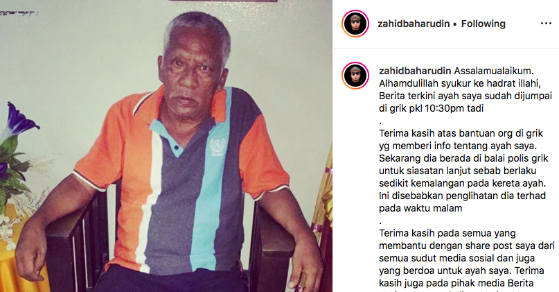 Tindakan netizen berkongsi info berkaitan kehilangan itu akhirnya berjaya mengesan warga emas berusia 70 tahun tersebut kira-kira pukul 10.30 malam Ahad.