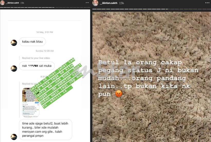 Sebelum itu, Intan turut memuat naik paparan skrin mesej berbaur lucah yang diterima daripada seorang netizen.