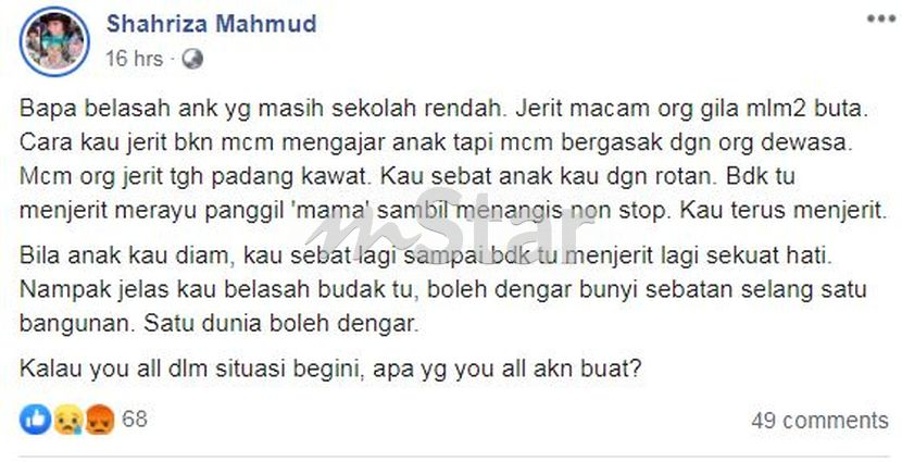 Menerusi pengkongsian tersebut, Shahriza memberitahu lelaki tersebut memukul anaknya menggunakan rotan tanpa henti dan belas kasihan.