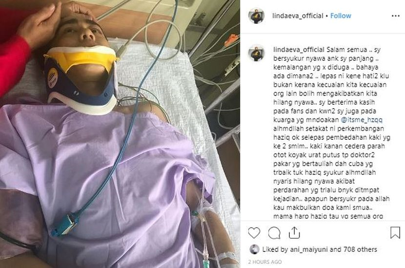 Ibunya yang juga penyanyi kumpulan Eva iaitu Linda, 42, memberitahu Haziq mengalami kecederaan parah pada bahagian kaki sehingga terpaksa menjalani pembedahan sebanyak dua kali.