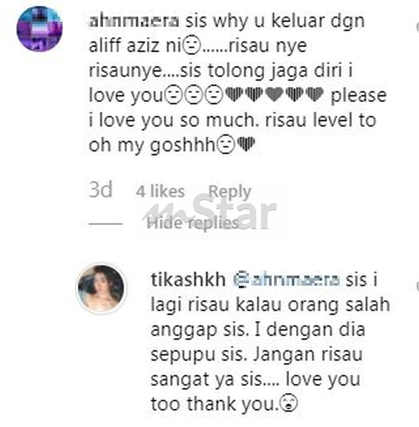 "Sis, saya lagi risau kalau orang salah anggap. Saya dengan dia sepupu. Jangan risau sangat ya sis... I love you too thank you," ujarnya ketika menjawab komen seorang netizen.
