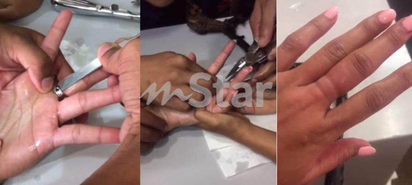 Menerusi video yang dimuat naik di laman sosial itu, Ning berdepan detik cemas ketika proses memotong logam bagi menanggalkan cincin tersebut.