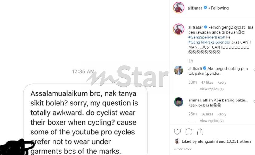 "Kerana ada pengayuh profesional di Youtube memberitahu lebih baik tidak memakai seluar dalam," demikian bunyi soalan berkenaan seperti yang dikongsikan Alif.