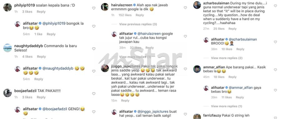 Menerusi jawapan balas kepada komen-komen pengikutnya, Alif secara tidak langsung memberi jawapan bahawa dia juga lebih selesa untuk tidak memakai seluar dalam ketika berbasikal.