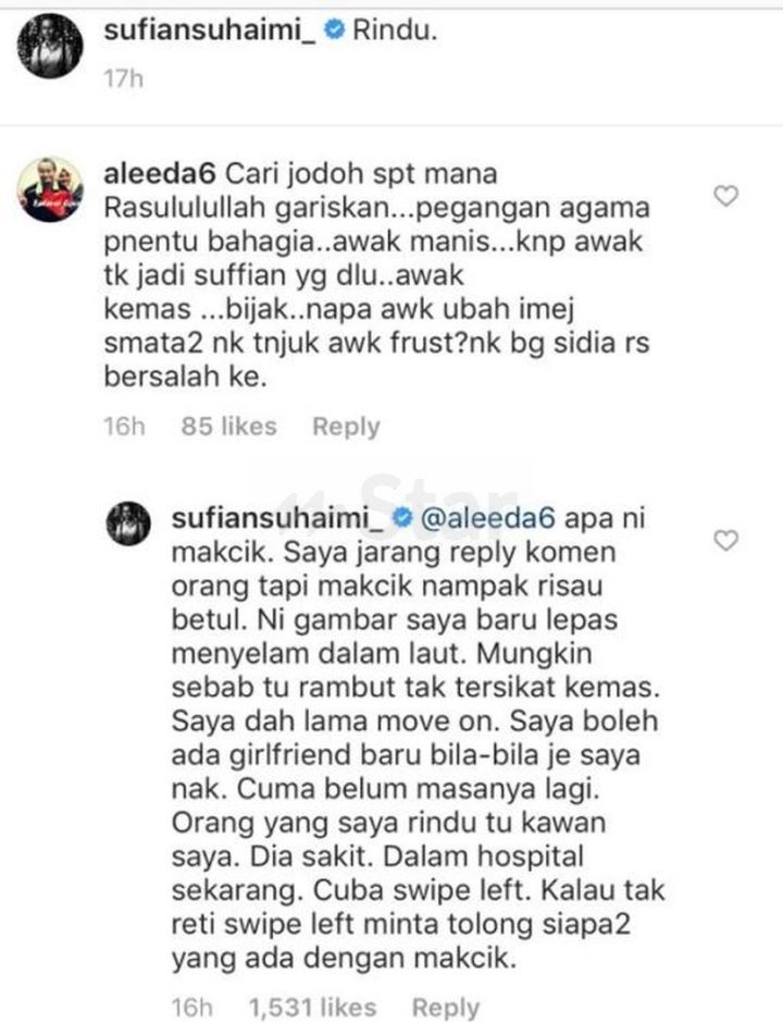 Sufian yang membalas komen tersebut menjelaskan penampilan tidak terurus itu disebabkan dia baru selesai melakukan aktiviti menyelam.