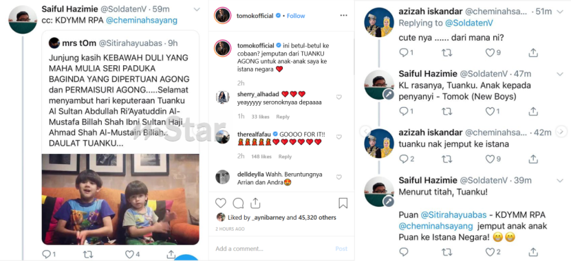 Terdahulu, Tomok menerusi Instagram miliknya pada Isnin berkongsi beberapa paparan skrin dari akaun Twitter Tunku Azizah @cheminahsayang yang menjemput kedua-dua anaknya ke Istana Negara.