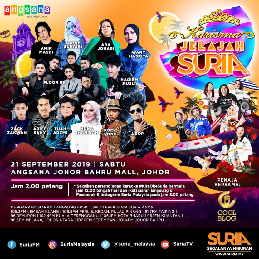 SELEPAS menghiburkan Shah Alam dan Kuantan, Karisma Jelajah Suria bakal berada di Angsana Mall, Johor Bahru dengan menampilkan beberapa artis popular tanah air pada Sabtu ini.