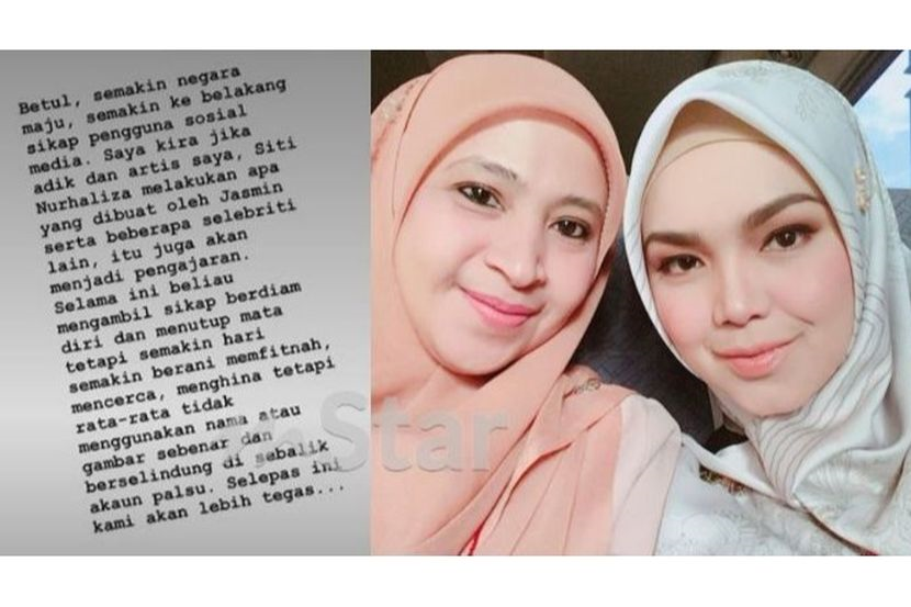 "Semakin negara maju, semakin ke belakang sikap pengguna media sosial. Saya kira jika adik dan artis saya (Siti) melakukan apa yang dibuat oleh Jasmin serta beberapa selebriti lain, itu juga akan menjadi pengajaran.