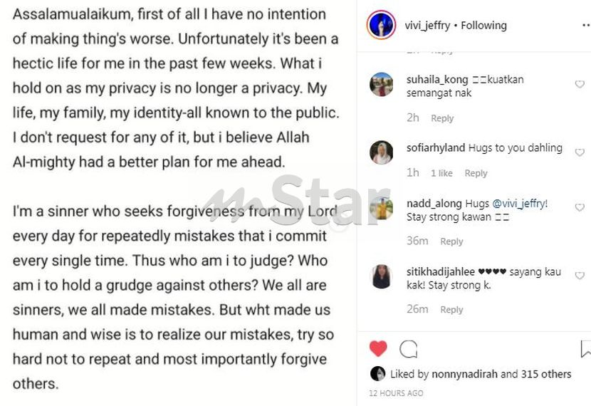 Kata Vivi, biarpun kemelut yang berlaku antara mereka bukan atas kehendaknya namun dia percaya Allah mempunyai perancangan yang baik di masa hadapan.