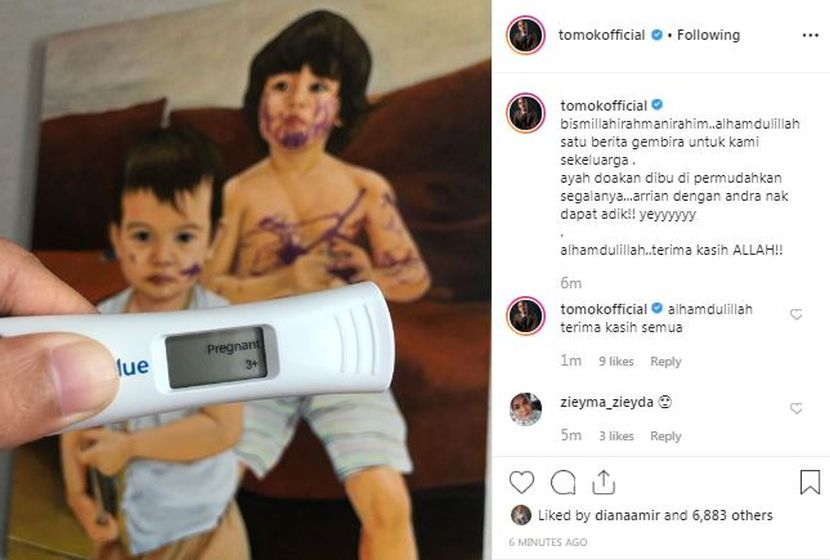 Menerusi laman Instagram, Tomok atau nama Shah Indrawan Ismail, 35, memuat naik foto alat ujian kehamilan dan mengucapkan syukur di atas kurniaan tersebut.