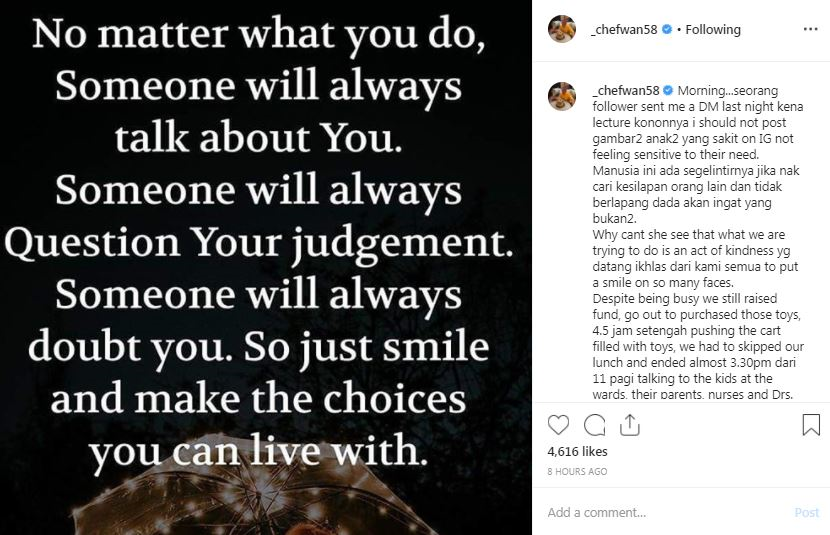 "Seorang follower ada menghantar DM malam tadi, bebel kononnya saya tak patut post gambar anak-anak yang sakit di Instagram kononnya tak sensitif dengan nasib mereka.