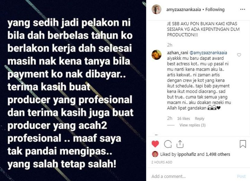 Amyza memuat naik status pelakon Azhan Rani berkaitan bayaran gajinya yang masih tidak dilunaskan pihak produksi.