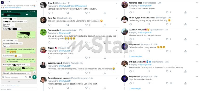 Tony meluahkan rasa kesal itu menerusi sebuah posting yang memaparkan paparan skrin perbualan menerusi aplikasi Whatsapp dengan seorang wakil produksi drama berkenaan.