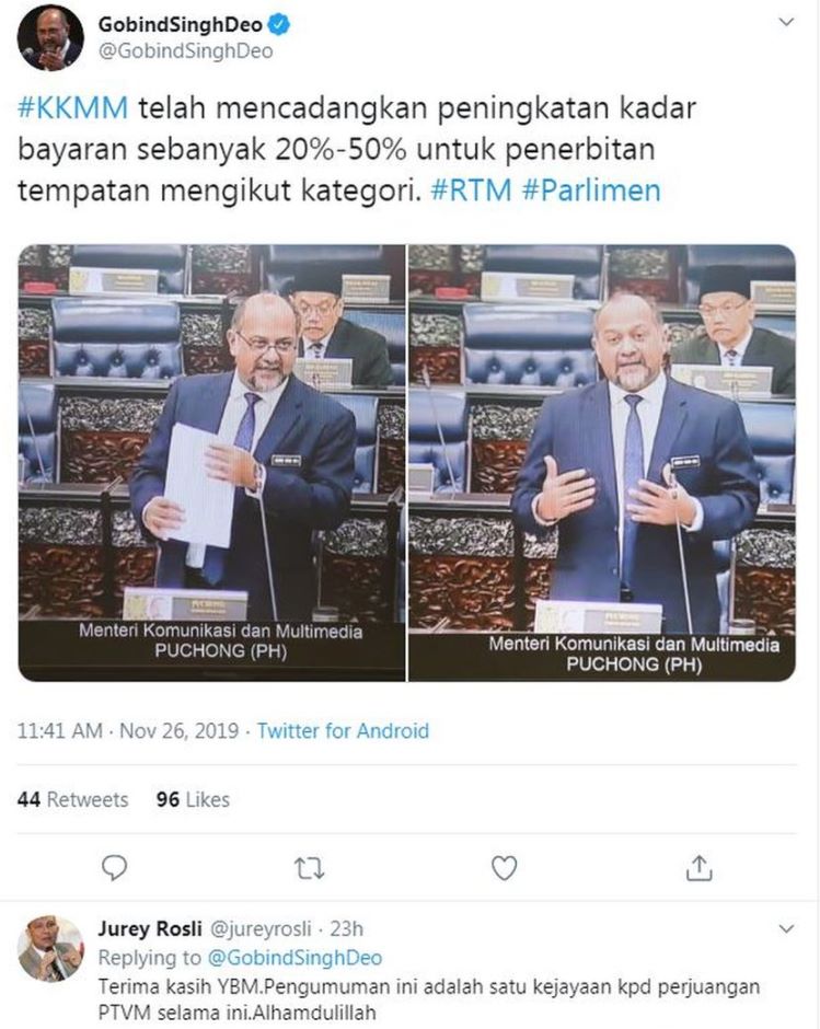 Sementara itu, Jurey berkata cadangan mengenai kadar bayaran yang diutarakan Gobind di parlimen itu merupakan petanda baik atas perjuangan PTVM sejak tahun 2008.