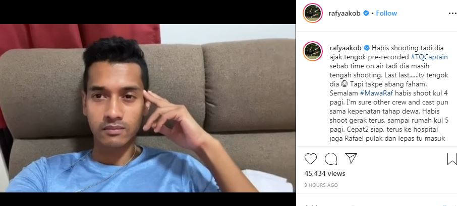 "Habis shoot terus balik sampai rumah pukul 5 pagi. Cepat-cepat siap, terus ke hospital jaga Rafael pula dan lepas tu masuk set balik tengah hari tadi.