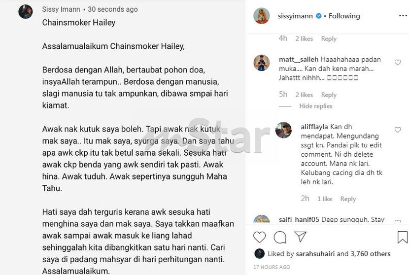 Bagaimanapun, menerusi ruang komen IG Sissy, seorang pengikutnya memberitahu komen asal individu berkenaan sudah dipadam dan akaun individu itu juga ditutup.