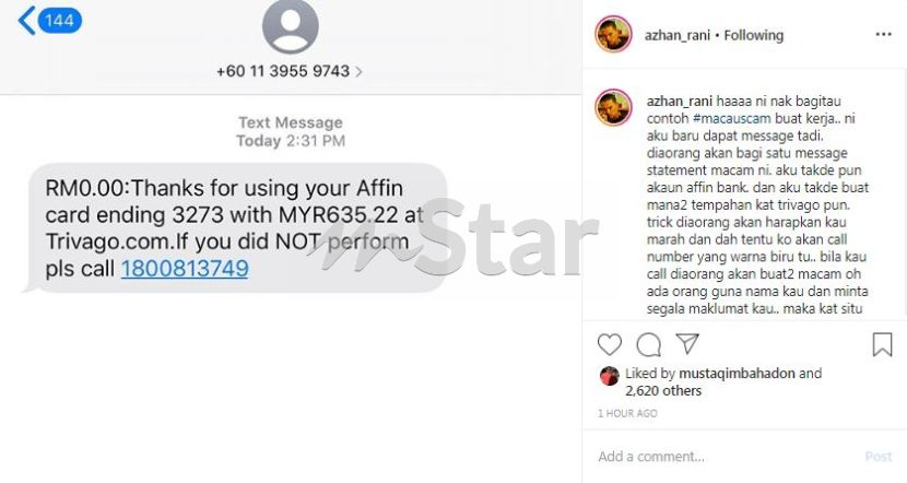 "Trick mereka akan harapkan kau marah dan sudah tentu kau akan call number yang warna biru tu. Bila kau call mereka akan buat-buat macam ada orang guna nama kau dan minta segala maklumat.