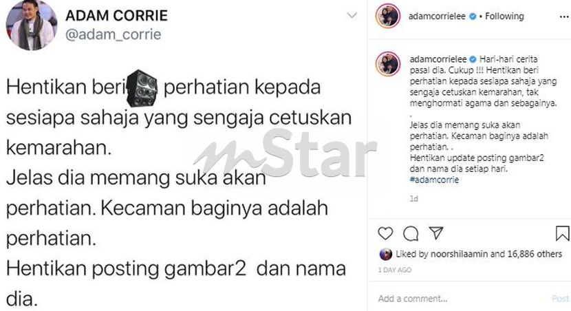 Namun menerusi Instagram pelakon Adam Corrie, dia menyeru semua pihak agar berhenti memberikan perhatian kepada mana-mana individu yang tidak menghormati agama.