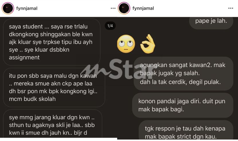 "Tengok respon saja tahu dah kenapa mak bapa strict dengan kau," kata Fyn yang membalas mesej individu itu.