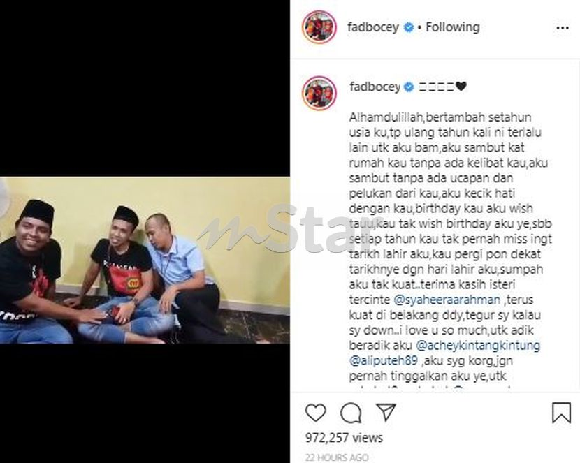 Fad menerusi Instagram memberitahu sambutan ulang tahun kelahirannya yang ke-29 pada Khamis berbeza tanpa pelukan Allahyarham Abam atau Syed Umar Mokhtar Syed Mohd Redzuan.