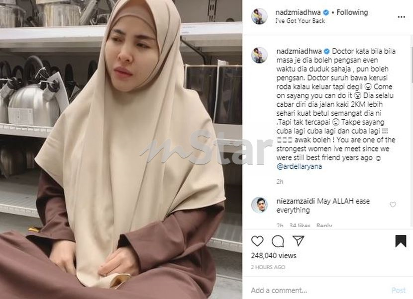 Nadzmi berkata biarpun doktor menasihati Ardell menggunakan kerusi roda berikutan dikhuatiri pengsan pada bila-bila masa namun isterinya itu tetap berdegil.