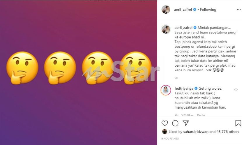 "Memang tak boleh tukar tarikh ke airline ini? Macam mana ya? Kalau tak pergi pula, mahu kena burn hampir RM150,000," katanya.