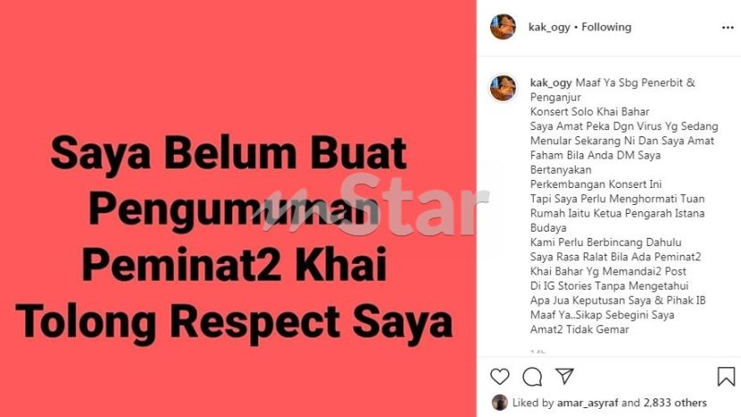 "Saya belum buat pengumuman. Peminat-peminat Khai, tolong hormat saya. Maaf ya sebagai penerbit dan penganjur konsert solo Khai Bahar, saya amat peka dengan virus yang sedang menular sekarang.