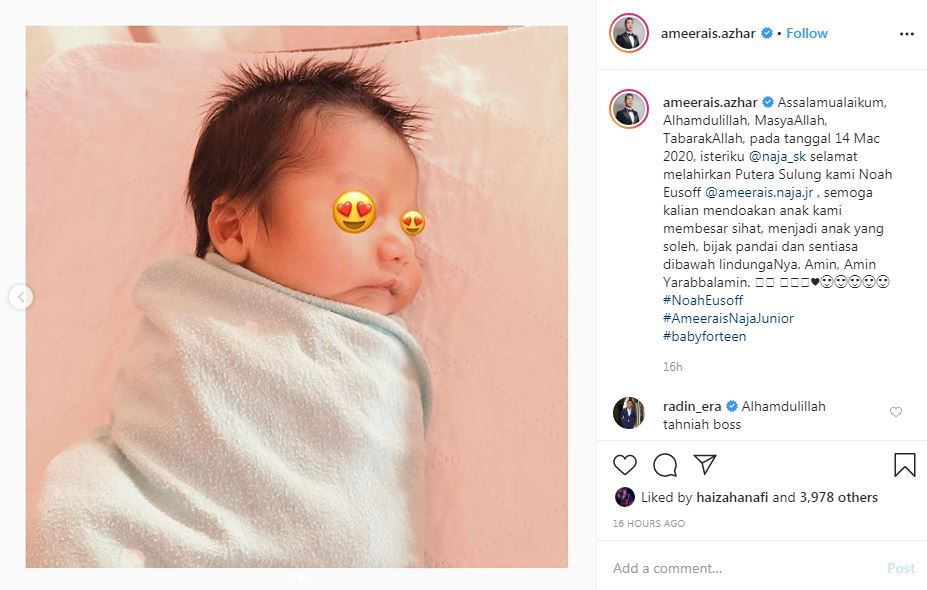 Dalam hantaran itu, Ameer turut berkongsi akaun Instagram anaknya yang diberikan nama sebagai @ameerais.naja.jr.