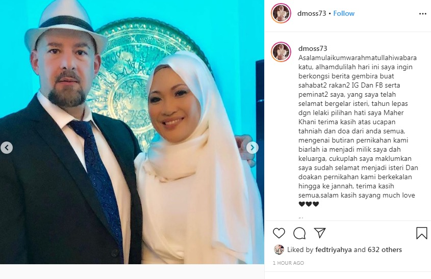 "Saya telah selamat bergelar isteri tahun lalu dengan lelaki pilihan saya, Maher Khani. Terima kasih atas ucapan tahniah dan doa daripada anda semua.