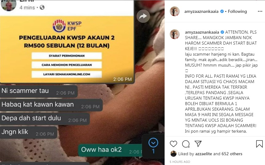 Aktres itu berkongsi maklumat mengenai scammer dan kemudahan KWSP itu di laman Instagramnya dan rata-rata netizen menyokong tindakannya itu.