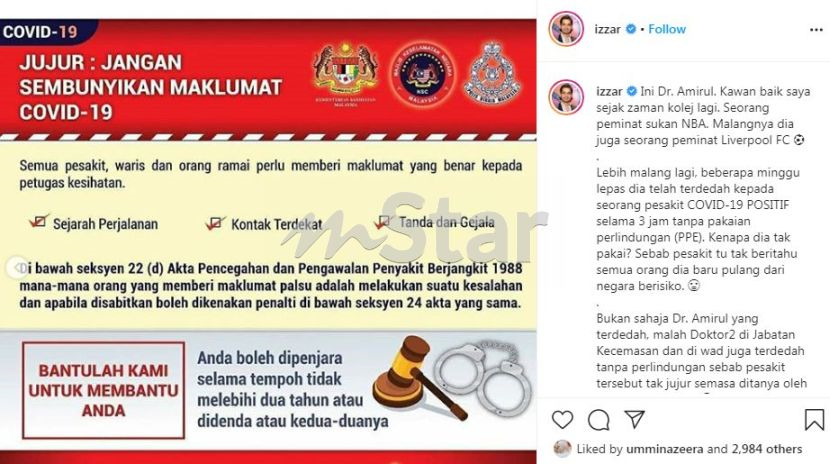 Menurut Dr Izzar, rakannya yang dikenali sebagai Dr Amirul dan beberapa doktor di jabatan kecemasan dan wad sebuah hospital terpaksa dikuarantin akibat sikap pesakit yang tidak bertanggungjawab.