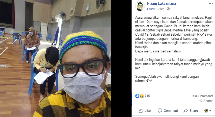 "Bapa mertua dimasukkan ke wad semalam.... hari ini (Selasa) pukul 10 pagi saya, isteri dan dua anak perempuan akan membuat saringan Covid-19.