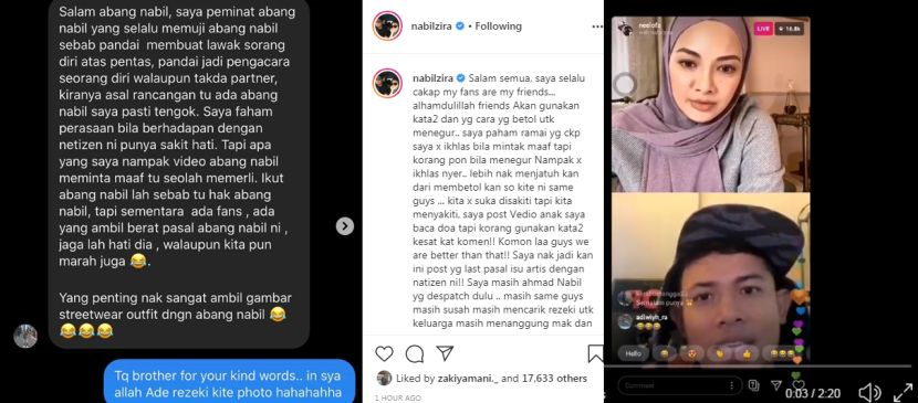 Nabil menerusi laman Intagram turut memuat naik paparan skrin seorang individu yang menegur permohonan maaf tersebut dilihat seperti menyindir netizen.