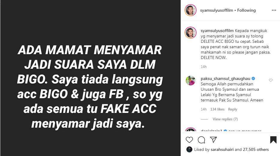 Syamsul memberi amaran kepada individu tersebut di Instagramnya.