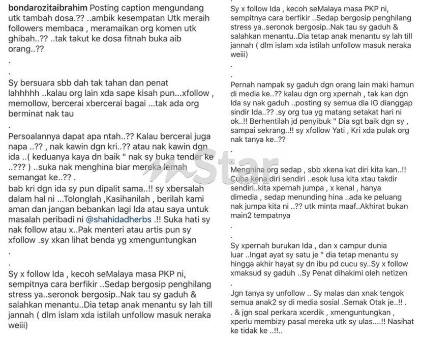 "Saya tak follow Ida (Shahidah) kecoh satu Malaya masa PKP (Perintah Kawalan Pergerakan) ni, sempitnya cara berfikir... sedap bergosip penghilang stres ya... seronok bergosip? Nak tahu saya gaduh dan salahkan menantu... dia tetap anak menantu saya sampai Jannah, dalam Islam tak ada istilah unfollow masuk neraka.