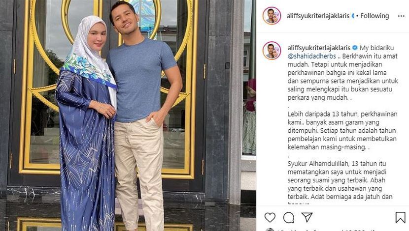 SEPANJANG 13 tahun perkahwinan dengan Datin Seri Nur Shahidah, usahawan kosmetik Datuk Seri Aliff Syukri berkata dia lebih matang dalam mengharungi kehidupan sebagai seorang suami. Menurut Aliff, 33, dalam melayari hubungan itu pasti akan ada kekurangan dan proses memperbaiki diri itu berlaku setiap hari. "Berkahwin itu amat mudah tetapi untuk menjadikan perkahwinan bahagia ini kekal lama dan sempurna serta saling melengkapi bukan sesuatu perkara yang mudah. ARTIKEL BERKAITAN: Aliff Syukri kembali ke pangkuan isteri selepas 4 bulan berasingan - “Doakan saya dan keluarga bahagia semula. I'm back!” "Lebih daripada 13 tahun perkahwinan kami, banyak asam garam yang ditempuhi. Setiap tahun adalah tahun pembelajaran kami untuk memperbetulkan kelemahan masing-masing. "Syukur Alhamdulillah, 13 tahun itu mematangkan saya untuk menjadi seorang suami, abah dan usahawan yang terbaik," katanya. Aliff sedar isteri menjadi tulang belakang dalam hidupnya. Penyanyi lagu Cuba Bahagia ini berkongsi luahan hatinya untuk isteri tercinta menerusi laman Instagram. Pada Mac lalu, pasangan ini menjadi perbualan hangat netizen apabila rumah tangga mereka dikatakan bergolak. Bagaimanapun, setelah empat bulan tinggal berjauhan dengan isteri dan anak-anak, Aliff mula menyedari kekurangan diri dan memilih untuk kembali semula bersama keluarga. Sementara itu, Alif berkata kebahagiaan paling utama dalam kehidupan adalah apabila dapat bersama keluarga di sisi. Perkongsian Aliff menerima komen positif pengikut. "Tetapi benda yang paling penting sekali adalah kebahagiaan yang hakiki iaitu bersama dengan keluarga dan ibu bapa kita. "Semoga semua rakan-rakan saya di laman sosial, pekerja... anda adalah orang yang hadir dalam hidup saya adalah yang terbaik. "InsyaAllah saya doakan! Semoga kita sama-sama mendoakan untuk kebahagiaan orang lain juga," ujarnya. Aliff Syukri dan Nur Shahida berkahwin pada tahun 2007. Pasangan ini dikurniakan lima orang cahaya mata iaitu Ammaar Ahyan, Qadejah El Zahra, Ibraheem Adham dan Yusoff Al Qardawy dan Raudhah Arshiyah serta seorang anak angkat. Sebelum ini, Aliff terpalit dengan beberapa kontroversi sehingga menerima kecaman teruk daripada banyak pihak termasuklah daripada ahli keluarga sendiri. Nak macam-macam info? Join grup Telegram mStar!